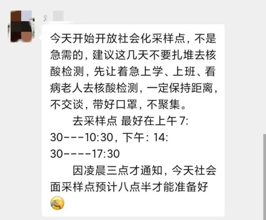有网友爆料称,15日凌晨三点社区发通知,称开始开放社会化核酸采样点,时间最好在上午7:30---10:30,下午14:30----17:30。统一使用20混1管进行采样,自愿、免费。