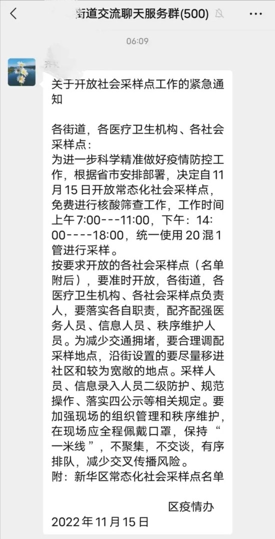 14日晚间,一份《关于迅速开放核酸采样点》的通知文件在网络流传,文件显示,为进一步落实科学精准防控要求,向群众提供更加便捷、安全、高效的服务,按照省应对疫情工作领导小组《关于贯彻落实国家优化疫情防控二十条实施措施的实施方案》要求,对开放免费核酸采样点提出以下工作要求:按照就近就便原则,采样点在布局上满足群众采样需求;自11月15日起,各区每日开放采样点不少于三十个。