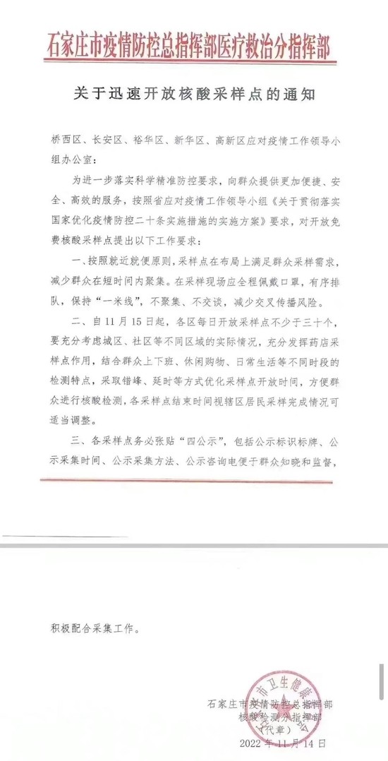 “自今起,石家庄关闭市内免费核酸检测网点。”11月14日,石家庄疫情防控政策引发广泛关注。