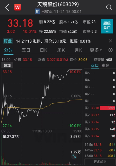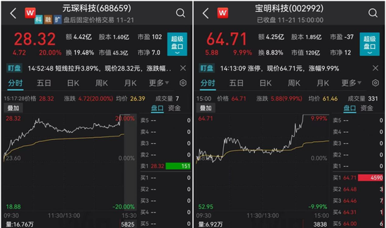 11月21日A股低开后探底回升,三大指数均小幅下跌。截至收盘,沪指跌0.39%,深成指跌0.41%,创业板指跌0.1%。总体上个股涨多跌少,两市超2500只个股上涨,合计成交8492亿元。北向资金全天净卖出20.46亿元。 ![]() 盘面上,抗疫概念股表现突出,热景生物(87.960, 14.66, 20.00%)、九安医疗(55.760, 5.07, 10.00%)、明德生物(71.140, 6.47, 10.00%)等涨停;复合集流体概念股大涨,元琛科技(28.320, 4.72, 20.00%)“20CM”涨停,宝明科技(64.710, 5.88, 9.99%)、双星新材(13.880, 1.26, 9.98%)、英联股份(9.790, 0.89, 10.00%)涨停;赛道股展开反弹,HJT电池概念股领涨,海源复材(17.370, 1.58, 10.01%)、乾景园林(6.050, 0.55, 10.00%)涨停;供销社概念股龙头天鹅股份(33.180, 3.02, 10.01%)复牌上演“准地天板”,收获11连板;信创概念股午后再度活跃,南天信息(22.900, 2.08, 9.99%)、吉大正元(43.010, 3.91, 10.00%)、信雅达(12.740, 1.16, 10.02%)等涨停。消费股展开调整,教育、旅游、手机游戏、饮料制造等板块跌幅居前,贵州茅台(1519.980, -47.15, -3.01%)跌逾3%。 抗疫概念股大涨 “石家庄茅台”再创新高 抗疫概念股今日再度走强,热景生物“20CM”涨停,万孚生物(43.990, 4.88, 12.48%)涨逾10%,明德生物和去年的14倍大牛股九安医疗等涨停。 ![]() 在网上被众多投资者称为“石家庄茅台”的以岭药业(46.000, -0.28, -0.61%)早盘振幅超过10%,并再创历史新高,午后震荡回落。截至收盘,以岭药业报46元/股,下跌0.61%,单日换手率近13%,成交额高达80亿元,位居今日A股成交额榜首。 ![]() Wind数据显示,今日涨停的九安医疗、中国医药(18.100, 1.65, 10.03%)和明德生物主力资金净流入额分别达10.15亿元、7.36亿元和5.65亿元;而此前4个交易日主力资金累计净流入额超过20亿元的以岭药业,今日主力资金净流出达9200万元。 供销社概念股走强 天鹅股份11连板 供销社概念股集体大幅走强,天鹅股份上演“准地天板”涨停,浙农股份(16.730, 1.52, 9.99%)涨停,天禾股份(11.090, 0.82, 7.98%)、中农联合(29.800, 1.50, 5.30%)等涨逾5%。 ![]() 消息面上,中央网信办、农业农村部启动联合制订《数字乡村建设指南2.0》,《指南》将围绕信息基础设施、农业全产业链数字化、乡村建设治理数字化、乡村公共服务数字化、乡村数字文化、智慧绿色乡村等方面,进一步完善内容、丰富案例,更好地指导各地建设数字乡村。 今日复牌的天鹅股份再度涨停,收获11连板,累计涨逾185%。此前10连板后,公司停牌核查5个交易日。 ![]() 公司是山东省供销社控股上市公司,其主营业务为棉花加工成套设备及配件的研发、生产和销售。复牌公告表示,2019年至2021年,公司与山东省供销社控制下的企业近年来发生的业务往来均为房屋租赁或房屋承租业务,占公司营业收入或营业成本的比例较小。 今年前三季度,公司实现营业收入2.79亿元,同比增长15.77%;归母净利润1263.03万元,同比增长127.07%。 复合集流体概念股持续走强 复合集流体概念板块龙头宝明科技午后封涨停,10月以来股价翻倍;元琛科技尾盘封住“20CM”涨停,英联股份、双星新材、大东南(3.360, 0.31, 10.16%)(维权)早盘已率先涨停,万顺新材(10.990, 1.19, 12.14%)、骄成超声(179.000, 15.32, 9.36%)均涨超9%。 ![]() 以上行情图片均来自Wind 据了解,复合集流体是一种新型的动力电池集流体材料,具有类似三明治的夹层结构。 中信证券(18.850, -0.30, -1.57%)研报表示,复合集流体即将迎来量产,2023年有望成为量产元年。 编辑:亚文辉
