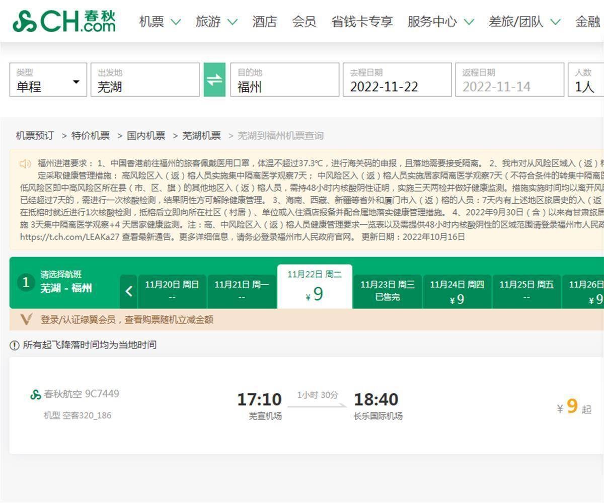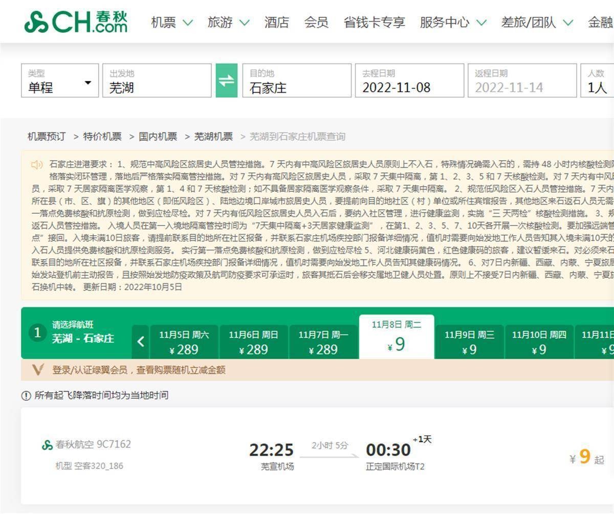 网传沈阳飞芜湖机票9元,春秋航空回应:属实 网传沈阳飞芜湖机票仅需9元,由春秋航空执飞。11月1日,极目新闻记者向春秋航空求证。相关负责人表示,9元机票属实,属于开航特惠活动。不仅仅是芜湖-沈阳航线,芜湖至福州、石家庄航线的开航机票也低至9元。 网传沈阳飞芜湖9元机票属实 近日有网友发现,从沈阳桃仙国际机场飞往安徽芜湖芜宣机场的机票只需9元。11月1日,春秋航空相关负责人告诉极目新闻记者,9元机票属实。不仅仅是芜湖-沈阳航线有9元机票,芜湖-福州、芜湖-石家庄等航线的特价机票也仅需9元,芜湖飞厦门的特价机票也仅需59元。 ![]() 春秋航空官网上,芜湖至沈阳机票低至9元 春秋航空相关负责人介绍,该航司入驻安徽芜湖芜宣机场,并新开通了4条航线,分别是芜湖-厦门、芜湖-石家庄、芜湖-沈阳、芜湖-福州,均为春秋航空独飞。在开航初期,推出特价机票活动,主要是想培养大家坐飞机的习惯。让旅客们知道,芜宣机场是芜湖人家门口的机场,今后出行不仅仅可以乘坐火车,也可以坐飞机,进一步便利旅客出行。 ![]() ![]() 芜湖至石家庄、福州票价也低至9元 该负责人称,不仅仅是这次开航活动,春秋航空也曾多次推出9元特价机票活动。此前该航司开通武汉至大阪航线,也曾推出过299元的特价机票。甚至有其他出发城市,有9元(不含税)的特价跨国机票。 开航优惠机票票价低于火车票 极目新闻记者在多个订票平台上发现,不少平台针对该9元机票继续优惠,更有平台优惠到3元。以旅客芜湖飞沈阳为例,只需再加上170元的机建燃油费,即可顺利出行。 ![]() 以芜湖至沈阳为例,只需另支付170元机建燃油费 极目新闻记者在12306平台搜索发现,芜湖至沈阳没有直达火车,需要在南京或合肥中转,火车票票价700多元,路上需要花费9小时30分左右。同样,芜湖至福州也没有直达火车,需要在杭州和合肥中转。芜湖至石家庄虽然有直达火车,但路途需要5时30分左右,票价为500多元。这些新航线开通后,不仅仅填补了部分城市之间的航班空白,也极大方便了当地居民出行。 春秋航空方面介绍,芜湖至石家庄,芜湖至厦门,这两条航线每天1班。芜湖至沈阳、芜湖至福州,每周3班。后续,春秋航空还将持续布局芜湖,打造更加密集合理的航线网络。 春秋航空提醒称,特价机票数量有限,有出行需求的旅客可以尽快预订。同时,旅客应及时关注目的地防疫政策,做好行程申报、健康码查验和登机前手消等工作。 |
