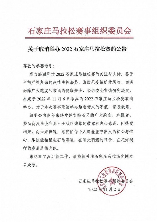 公告称,鉴于当前严峻复杂的疫情防控形势,为防范疫情扩散风险,切实保障广大跑友和市民的健康安全,经组委会审慎研究决定,原定于2022年11月6日举办的2022石家庄马拉松赛取消举办。
