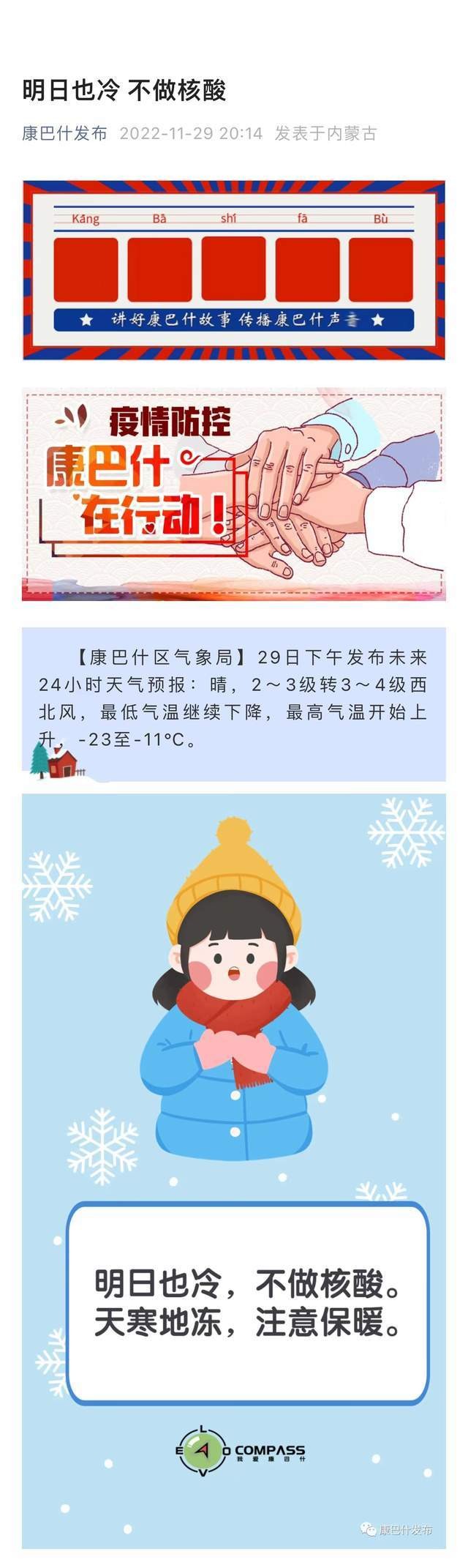11月29日20点14分,内蒙古自治区鄂尔多斯市康巴什区再次发布通告称,明日也冷,不做核酸。 ![]() 11月28日晚11点22分,内蒙古自治区鄂尔多斯市康巴什区发布通告: ![]() ![]() 据鄂尔多斯气象部门29日下午发布未来24小时天气预报:晴,2~3级转3~4级西北风,最低气温继续下降,最高气温开始上升,-23至-11℃。 鄂尔多斯市气象局康巴什区气象分局已启动重大气象灾害(寒潮)III级应急响应。受强冷空气影响,预计将陆续出现大风、沙尘、强寒潮天气,24小时降温幅度可达 12℃以上,过程降幅 14℃,30日凌晨最低气温可达零下21°C,平均风力6级,阵风8级以上。 ![]() (综合微信公号“康巴什发布”等) 编辑:赵珊珊 |