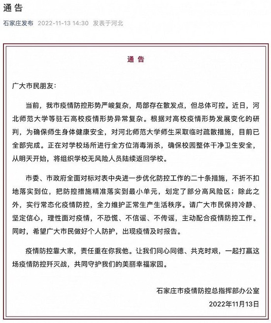 “石家庄发布”微信公众号消息,石家庄市疫情防控总指挥部办公室11月13日发布通告,当前,石家庄市疫情防控形势严峻复杂,局部存在散发点,但总体可控。近日,河北师范大学等驻石高校疫情形势异常复杂。根据对高校疫情形势发展变化的研判,为确保师生身体健康安全,对河北师范大学师生采取临时疏散措施,目前已全部完成。正在对学校场所进行全方位消毒消杀,确保校园整体干净卫生安全,从明天开始,将组织学校无风险人员陆续返回学校。
