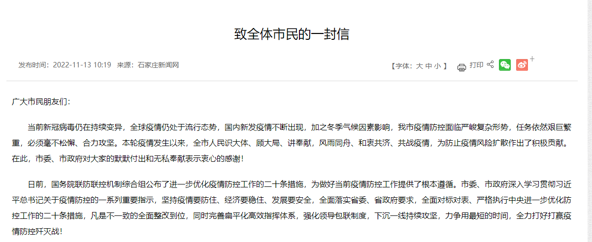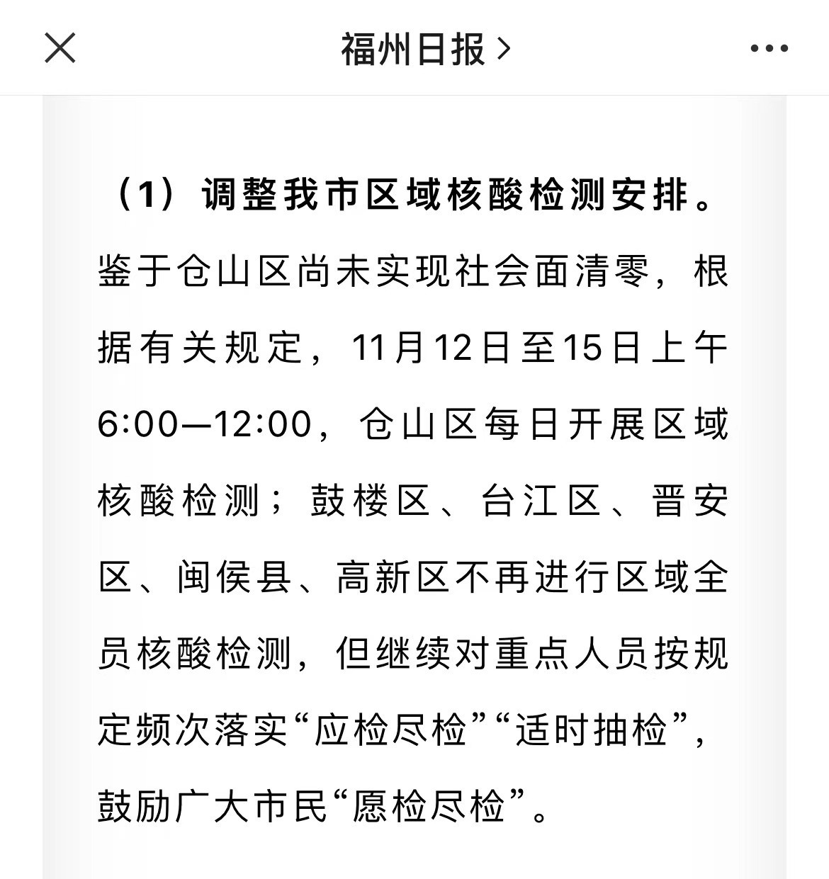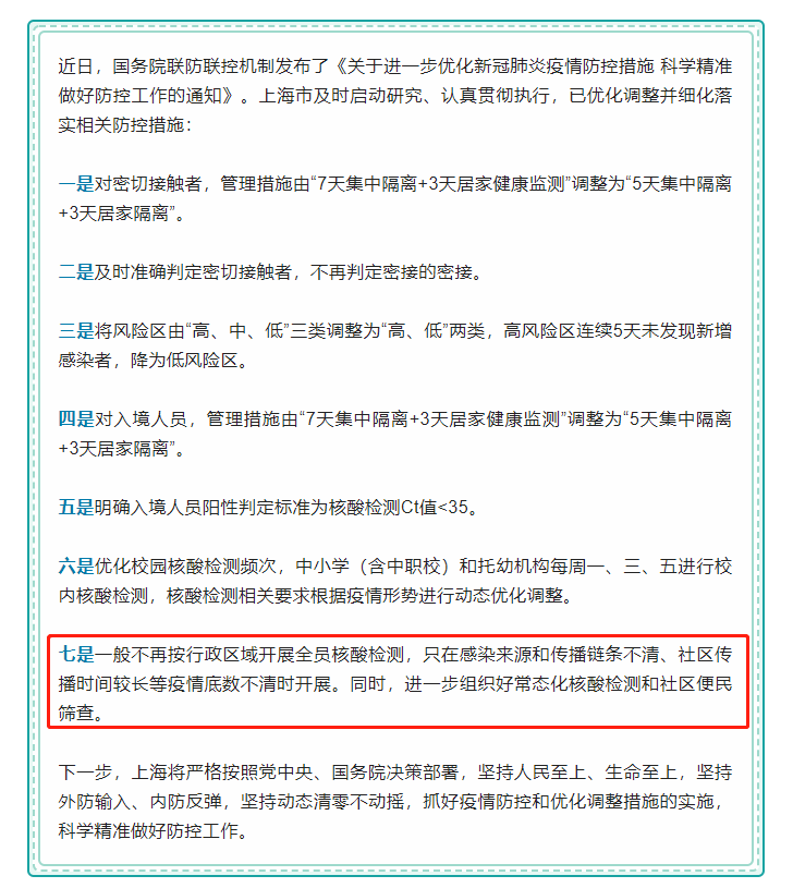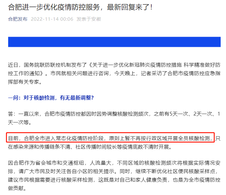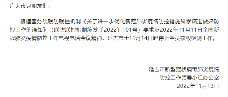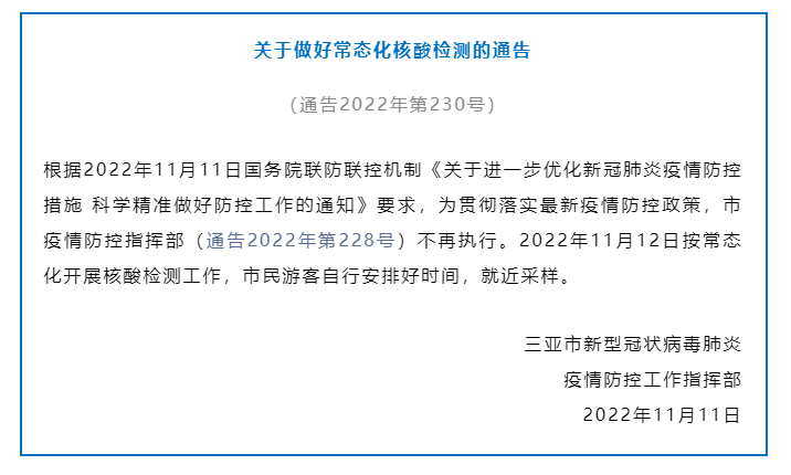 每经编辑 张锦河 11月11日,国务院联防联控机制发布了《关于进一步优化新冠肺炎疫情防控措施,科学精准做好防控工作的通知》,对进一步优化防控工作提出了二十条措施(下称“20条”)。 20条中提到不再判定密接的密接,将风险区由“高、中、低”三类调整为“高、低”两类,没有发生疫情的地区严格按照第九版防控方案确定的范围对风险岗位、重点人员开展核酸检测,不得扩大核酸检测范围。一般不按行政区域开展全员核酸检测,只在感染来源和传播链条不清、社区传播时间较长等疫情底数不清时开展。 截至11月14日发稿,福建省福州市、江西省广昌县、辽宁省延吉市、安徽省合肥市、上海市等多地都已积极调整现行的防疫政策,宣布取消或暂不开展区域全员核酸检测。 11月11日中午,海南省三亚市发布通知,要求三亚市辖区内的全体居民、游客于本周六(12日)参加核酸检测,对于未按要求参加核酸采样的人员,将被赋黄码。7小时后,三亚市再次发布通告,称为贯彻落实最新疫情防控政策,之前发布的区域核酸检测不再执行。2022年11月12日按常态化开展核酸检测工作,市民游客自行安排好时间,就近采样。 ![]() 此后,福建、江西、辽宁、上海等多地宣布取消区域全员核酸检测。 12日,福建省福州市召开新闻发布会,通报疫情防控最新情况。其中提出,鉴于仓山区尚未实现社会面清零,根据有关规定,11月12日至15日上午6:00—12:00,仓山区每日开展区域核酸检测;鼓楼区、台江区、晋安区、闽侯县、高新区不再进行区域全员核酸检测。 ![]() 12日,江西省广昌县疫情防控应急指挥部办公室也发布消息称,鉴于11月8日~10日三天区域核酸检测结果均为阴性,根据上级最新相关文件精神,经专家组综合研判,决定取消11月13日-14日的区域核酸检测工作。 ![]() 11月13日,延吉市防疫部门发布公告,宣布于11月14日起停止全员核酸检测工作。此前,延吉市于11月7日发布公告,决定在8日~14日期间,按照指定街镇开展七天一轮全员核酸检测。 ![]() 同日,上海市也发布了优化调整并细化落实相关防控措施的内容,宣布一般不再按行政区域开展全员核酸检测,只在感染来源和传播链条不清、社区传播时间较长等疫情底数不清时开展。同时,进一步组织好常态化核酸检测和社区便民筛查。 ![]() ![]() 11月13日,石家庄发布致全体市民的一封信称,市委、市政府全面对标对表、严格执行中央进一步优化防控工作的二十条措施,凡是不一致的全面整改到位,同时完善扁平化高效指挥体系,强化领导包联制度,下沉一线持续攻坚,力争用最短的时间,全力打好打赢疫情防控歼灭战。 ![]() 根据“合肥发布”11月14日凌晨消息,安徽省合肥市疫情防控应急指挥部有关专家表示,合肥全市进入常态化疫情防控阶段,原则上暂不再按行政区域开展全员核酸检测,只在感染来源和传播链条不清、社区传播时间较长等疫情底数不清时开展。 ![]() 每日经济新闻综合自第一财经、合肥发布、石家庄新闻网、上海发布、三亚发布、福州日报等 封面图片来源:摄图网-501579113 ![]() 海量资讯、精准解读,尽在新浪财经APP