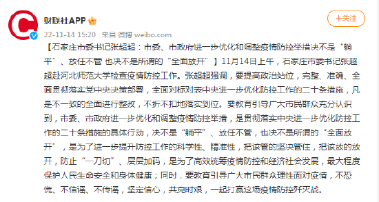 11月14日上午,石家庄市委书记张超超赴河北师范大学检查疫情防控工作。张超超强调,要提高政治站位,完整、准确、全面贯彻落实党中央决策部署,全面对标对表中央进一步优化防控工作的二十条措施,凡是不一致的全面进行整改,不折不扣地落实到位。要教育引导广大市民群众充分认识到,市委、市政府进一步优化和调整疫情防控举措,是贯彻落实中央进一步优化防控工作的二十条措施的具体行动,决不是“躺平”、放任不管,也决不是所谓的“全面放开”,是为了进一步提升防控工作的科学性、精准性,把该管的坚决管住,把该放的放开,防止“一刀切”、层层加码,是为了高效统筹疫情防控和经济社会发展,最大程度保护人民生命安全和身体健康;同时,要教育引导广大市民群众理性面对疫情,不恐慌、不信谣、不传谣,坚定信心,共克时艰,一起打赢这场疫情防控歼灭战。